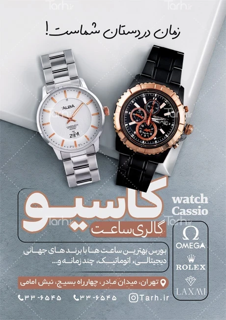دانلود تراکت لایه باز ساعت فروشی با فرمت psd و قابل ویرایش در نرمافزار فتوشاپ بهصورت لایه باز توسط تیم طراحان طرح دات آی آر طراحی شده است. در نمونه تراکت ساعت فروشی از تصاویر و المانهای باکیفیت و متناسب با استاندارد چاپ استفادهشده، همچنین نکات مهم در طرح تراکت ساعت فروشی مانند رنگبندی، رعایت حاشیه، فاصلهها، فضای کافی برای درج متن، سایز و نوع فونت مناسب طراحی تراکت و ... رعایت گردیده است. طرح لایه باز تراکت گالری ساعت شامل عکس ساعت مچی میباشد که المانهای استفادهشده در طرح تراکت گالری ساعت قابلیت ویرایش، جابهجایی و تغییر سایز را دارا بوده و شما میتوانید متناسب باسلیقه خودتان تراکت لایه باز فروشگاه ساعت را ویرایش نمایید، همچنین با تغییر تصاویر و متنها میتوانید طرح تراکت فروشگاه ساعت را به طرح تراکت کسب و کار مد نظر خود شخصی سازی نمایید.