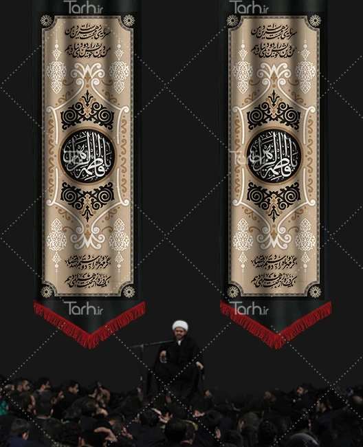 طرح کتیبه عمودی دهه فاطمیه با فرمت psd و قابل ویرایش در نرم افزار فتوشاپ به صورت لایه باز توسط تیم طراحان طرح دات آی آر طراحی شده است. در طرح کتیبه شهادت حضرت فاطمه از تصاویر و المان های با کیفیت و متناسب با استاندارد چاپ استفاده گردیده است. طرح کتیبه فاطمیه شامل خوشنویسی یا فاطمه الزهرا و طرح اسلیمی می باشد که المان های استفاده شده در طرح کتیبه عمودی شهادت حضرت زهرا قابلیت ویرایش، جابه جایی و تغییر سایز را دارا بوده و شما می توانید متناسب با سلیقه خودتان بنر شهادت حضرت فاطمه لایه باز را ویرایش نمایید.