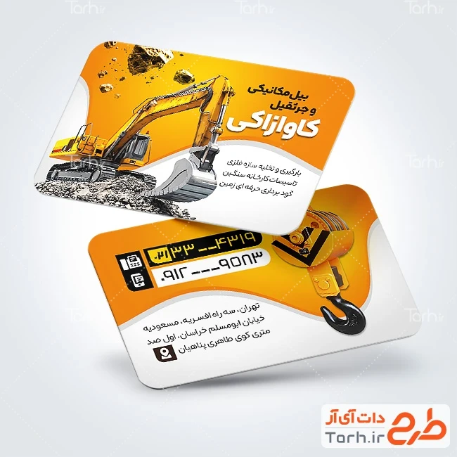 کارت ویزیت لایه باز جرثقیل و بیل مکانیکی با تم نارنجی کد فایل 3289675