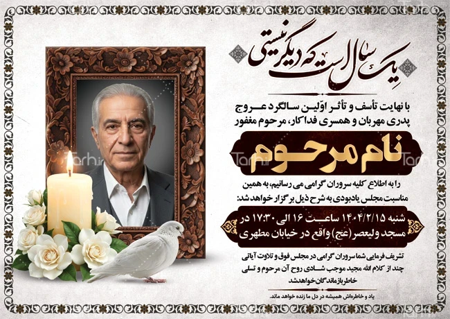 فایل لایه باز آگهی ترحیم سالگرد پدر با خوشنویسی یک سال است که دیگر نیستی کد فایل 3294017