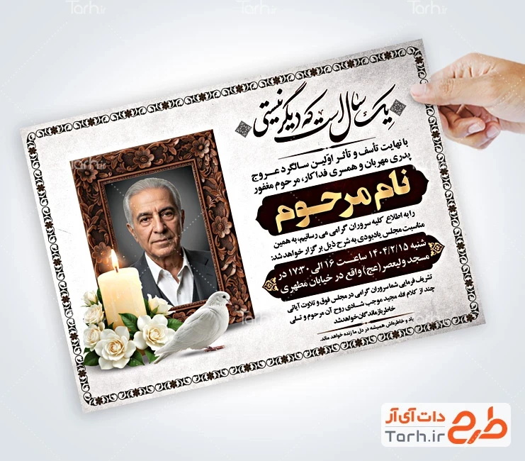 فایل لایه باز آگهی ترحیم سالگرد پدر با فرمت psd و قابل ویرایش در نرمافزار فتوشاپ بهصورت لایه باز توسط تیم طراحان طرح دات آی آر طراحی شده است. در فایل لایه باز اعلامیه ترحیم پدر از تصاویر و المانهای باکیفیت و متناسب با استاندارد چاپ استفادهشده، همچنین نکات مهم در طرح آگهی ترحیم پدر مانند رنگبندی، رعایت حاشیه، فاصلهها، فضای کافی برای درج متن، سایز و نوع فونت مناسب طراحی آگهی ترحیم و ... رعایت گردیده است. طرح خام آگهی ترحیم پدر شامل خوشنویسی یک سال است که دیگر نیستی، وکتور گل و شمع میباشد که المانهای استفادهشده در آگهی ترحیم لایه باز پدر قابلیت ویرایش، جابهجایی و تغییر سایز را دارا بوده و شما میتوانید متناسب باسلیقه خودتان نمونه اعلامیه ترحیم پدر را ویرایش نمایید.