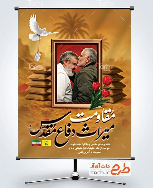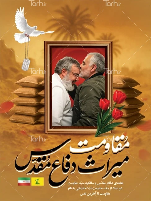 طرح لایه باز پوستر هفته دفاع مقدس و سالگرد سید حسن نصرالله با فرمت psd و قابل ویرایش در نرم افزار فتوشاپ به صورت لایه باز توسط تیم طراحان طرح دات آی آر طراحی شده است. در پوستر دفاع مقدس لایه باز از تصاویر و المان های با کیفیت و متناسب با استاندارد چاپ استفاده گردیده است. طرح پوستر شهدای دفاع مقدس شامل خوشنویسی دفاع مقدس، تصویر رزمنده و عکس گل می باشد که المان های استفاده شده در طرح لایه باز بنر هفته دفاع مقدس و سالگرد شهادت حسن نصرالله قابلیت ویرایش، جابه جایی و تغییر سایز را دارا بوده و شما می توانید متناسب با سلیقه خودتان طرح بنر هفته دفاع مقدس را ویرایش نمایید.