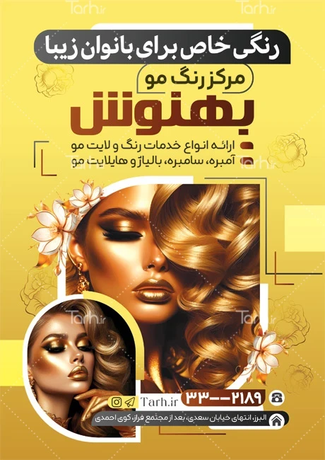 نمونه تراکت آماده سالن رنگ مو با فرمت psd و قابل ویرایش در نرمافزار فتوشاپ بهصورت لایه باز توسط تیم طراحان طرح دات آی آر طراحی شده است. در نمونه تراکت مرکز تخصصی رنگ مو از تصاویر و المانهای باکیفیت و متناسب با استاندارد چاپ استفادهشده، همچنین نکات مهم در تراکت لایه باز رنگ مو مانند رنگ بندی، رعایت حاشیه، فاصلهها، فضای کافی برای درج متن، سایز و نوع فونت مناسب طراحی تراکت و ... رعایت گردیده است. طرح لایه باز تراکت کراتین و احیای مو شامل عکس مدل زن میباشد که المانهای استفادهشده در طرح تراکت احیا و خدمات رنگ مو قابلیت ویرایش، جابهجایی و تغییر سایز را دارا بوده و شما میتوانید متناسب باسلیقه خودتان طرح تراکت خام آرایشگاه زنانه را ویرایش نمایید، همچنین با تغییر تصاویر و متنها میتوانید تراکت لایه باز کراتین و رنگ و لایت مو را به طرح تراکت کسب و کار مد نظر خود شخصی سازی نمایید.