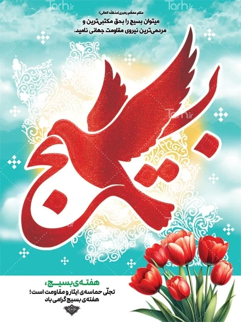 دانلود بنر خام هفته بسیج با فرمت psd و قابل ویرایش در نرم افزار فتوشاپ به صورت لایه باز توسط تیم طراحان طرح دات آی آر طراحی شده است. در طرح لایه باز هفته بسیج از تصاویر و المان های با کیفیت و متناسب با استاندارد چاپ استفاده گردیده است. پوستر هفته بسیج لایه باز شامل خوشنویسی بسیج و وکتور گل لاله می باشد که المان های استفاده شده در بنر لایه باز هفته بسیج قابلیت ویرایش، جابه جایی و تغییر سایز را دارا بوده و شما می توانید متناسب با سلیقه خودتان طرح بنر آغاز هفته بسیج را ویرایش نمایید.