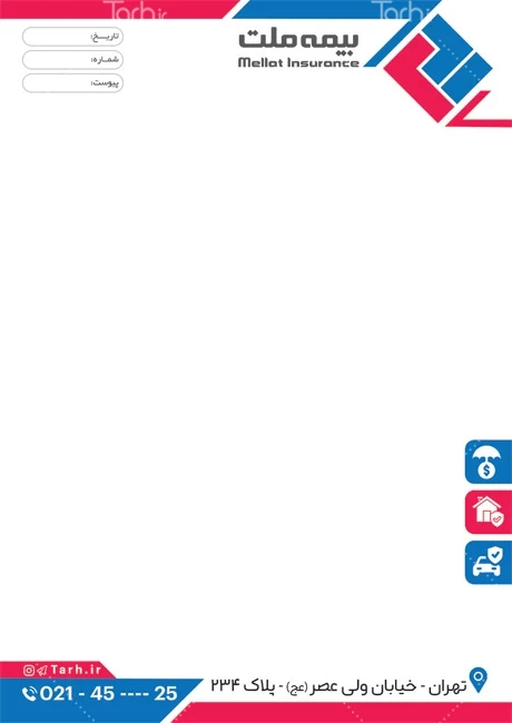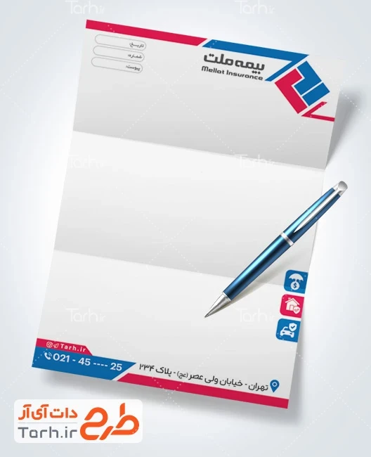 دانلود طرح سربرگ کارگزاری بیمه ملت با فرمت psd و قابل ویرایش در نرمافزار فتوشاپ بهصورت لایه باز توسط تیم طراحان طرح دات آی آر طراحی شده است. در طرح لایه باز سربرگ دفتر بیمه از المانهای باکیفیت و متناسب با استاندارد چاپ استفادهشده، همچنین نکات مهم در طرح سربرگ خام بیمه ملت مانند رنگبندی، رعایت حاشیه، فاصلهها، فضای کافی برای درج متن، سایز و نوع فونت مناسب طراحی سربرگ و ... رعایت گردیده است. سربرگ لایه باز بیمه ملت شامل لوگو بیمه ملت و محل جایگذاری مشخصات میباشد که المانهای استفادهشده در نمونه سربرگ بیمه ملت قابلیت ویرایش، جابهجایی و تغییر سایز را دارا بوده و شما میتوانید متناسب باسلیقه خودتان طرح سربرگ دفتر بیمه را ویرایش نمایید، همچنین با تغییر لوگو و متنها میتوانید طرح سربرگ کارگزاری بیمه ملت را به طرح سربرگ کسب و کار مد نظر خود شخصی سازی نمایید. در اسناد و نامههای اداری و تجاری، سربرگ به عنوان وسیلهای برای نمایش اطلاعاتی مانند نام و لوگو یک شرکت یا سازمان، عنوان سند، تاریخ، شماره صفحه و اطلاعات تماس ( شماره تلفن، آدرس پستی، وبسایت و ایمیل) به کار میرود. این اطلاعات به دریافتکننده کمک میکند تا به راحتی با شرکت یا سازمان تماس بگیرد یا از منابع اطلاعاتی بیشتری بهرهبرداری کند.