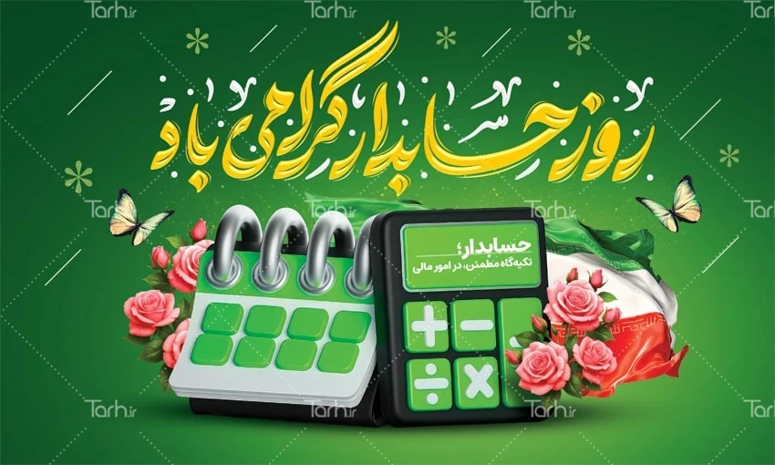 دانلود بنر لایه باز تبریک روز حسابدار با فرمت psd و قابل ویرایش در نرم افزار فتوشاپ به صورت لایه باز توسط تیم طراحان طرح دات آی آر طراحی شده است. در طرح لایه باز روز حسابدار از تصاویر و المان های با کیفیت و متناسب با استاندارد چاپ استفاده گردیده است. طرح بنر روز ملی حسابدار شامل خوشنویسی روز حسابدار گرامی باد، وکتور ماشین حساب، تقویم رومیزی، وکتور پرچم و وکتور گل می باشد که المان های استفاده شده در بنر لایه باز روز حسابدار قابلیت ویرایش، جابه جایی و تغییر سایز را دارا بوده و شما می توانید متناسب با سلیقه خودتان طرح بنر روز حسابدار را ویرایش نمایید.