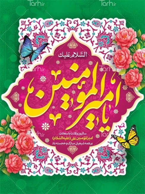 فایل بنر ولادت حضرت علی با فرمت psd و قابل ویرایش در نرم افزار فتوشاپ به صورت لایه باز توسط تیم طراحان طرح دات آی آر طراحی شده است. در طرح لایه باز ولادت حضرت علی از تصاویر و المان های با کیفیت و متناسب با استاندارد چاپ استفاده گردیده است. پوستر ولادت حضرت امیر شامل خوشنویسی یا امیرالمومنین، وکتور گل، پروانه و طرح اسلیمی میباشد که المان های استفاده شده در بنر میلاد حضرت امیرالمومنین قابلیت ویرایش، جابه جایی و تغییر سایز را دارا بوده و شما می توانید متناسب با سلیقه خودتان طرح بنر ولادت امام علی را ویرایش نمایید.
