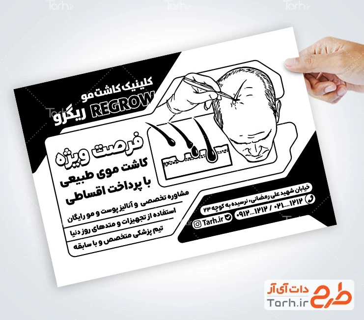 ابعاد قابل چاپ طرح تراکت سیاه سفید کاشت مو و کاربرد آن