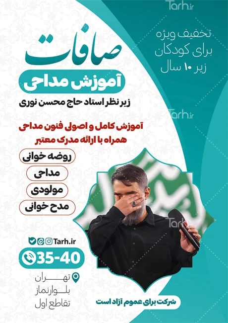 طرح آماده تراکت آموزشگاه مداحی با عکس مداح کد فایل 3587496