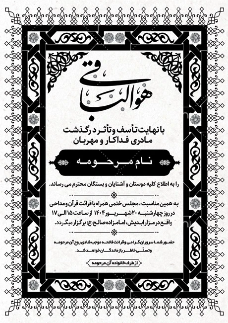 طرح لایه باز دعوتنامه ترحیم مادر با فرمت psd و قابل ویرایش در نرم افزار فتوشاپ به صورت لایه باز توسط تیم طراحان طرح دات آی آر طراحی شده است. در طرح لایه باز کارت دعوت ترحیم از تصاویر و المان های با کیفیت و متناسب با استاندارد چاپ استفاده گردیده است. طرح دعوتنامه مجلس ترحیم مادر شامل تایپوگرافی هوالباقی و کادر اسلیمی میباشد که المان های استفاده شده در طرح کارت دعوت مجلس ترحیم قابلیت ویرایش، جابه جایی و تغییر سایز را دارا بوده و شما می توانید متناسب با سلیقه خودتان طرح دعوت نامه ترحیم را ویرایش نمایید.