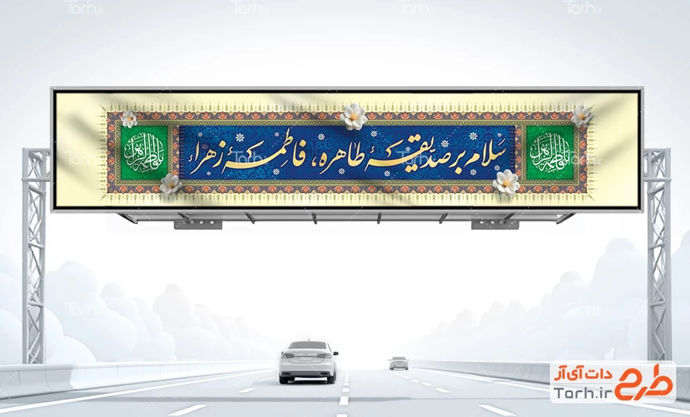 طرح بنر پل عابرپیاده تبریک ولادت حضرت فاطمه دارای تایپوگرافی سلام بر صدیقه طاهره کد فایل 3596478