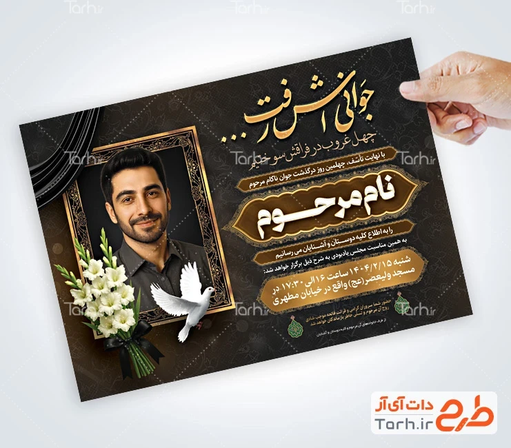 دانلود طرح آگهی ترحیم چهلم جوان ناکام با فرمت psd و قابل ویرایش در نرمافزار فتوشاپ بهصورت لایه باز توسط تیم طراحان طرح دات آی آر طراحی شده است. در فایل لایه باز اعلامیه ترحیم جوان از تصاویر و المانهای باکیفیت و متناسب با استاندارد چاپ استفادهشده، همچنین نکات مهم در طرح آگهی ترحیم جوان مانند رنگبندی، رعایت حاشیه، فاصلهها، فضای کافی برای درج متن، سایز و نوع فونت مناسب طراحی آگهی ترحیم و ... رعایت گردیده است. طرح لایه باز آگهی ترحیم قابل ویرایش پسر جوان شامل خوشنویسی جوانی اش رفت، محل جایگذاری عکس متوفی، عکس کبوتر و گل میباشد که المانهای استفادهشده در آگهی ترحیم لایه باز جوان قابلیت ویرایش، جابهجایی و تغییر سایز را دارا بوده و شما میتوانید متناسب باسلیقه خودتان نمونه اعلامیه ترحیم جوان را ویرایش نمایید.