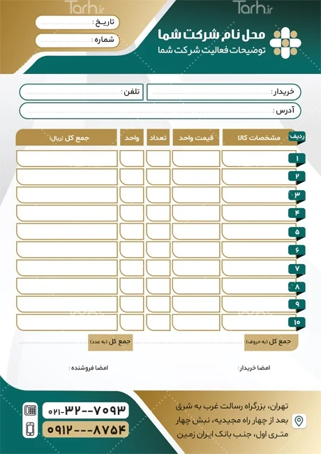 طرح خام فاکتور فروش با رنگبندی سبز و طلایی کد فایل 3618274