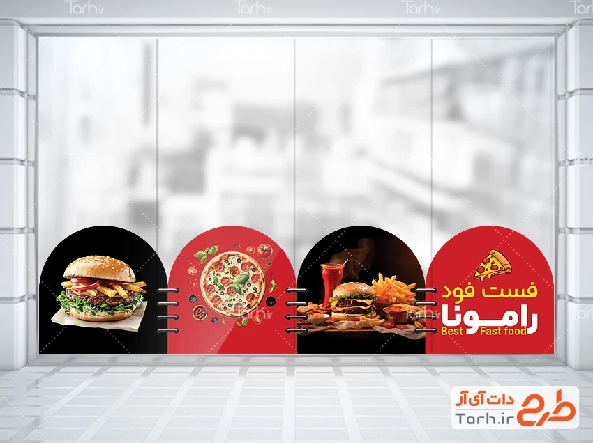 نمونه برچسب شیشه فست فود با بکگراند قرمز و مشکی کد فایل 3628740