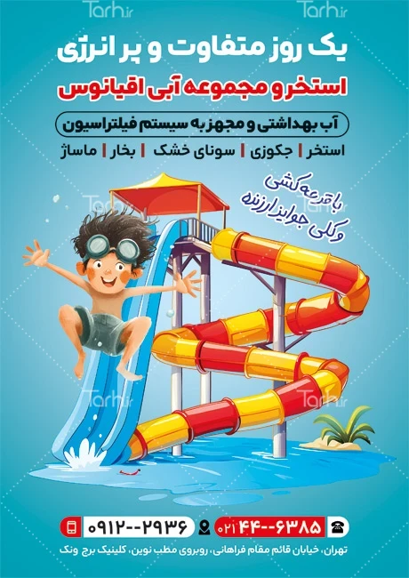 طرح آماده تراکت استخر دارای تصویرسازی سرسره آبی کد فایل 3658902