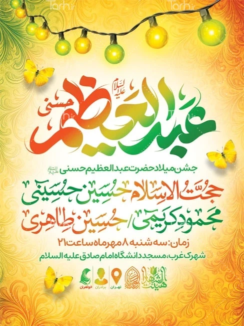 طرح بنر اطلاع رسانی میلاد شاه عبدالعظیم با فرمت psd و قابل ویرایش در نرم افزار فتوشاپ به صورت لایه باز توسط تیم طراحان طرح دات آی آر طراحی شده است. در طرح لایه باز اطلاعیه ولادت شاه عبدالعظیم از تصاویر و المان های با کیفیت و متناسب با استاندارد چاپ استفاده گردیده است. طرح اطلاعیه خام ولادت شاه عبدالعظیم شامل تایپوگرافی عبدالعظیم حسنی، وکتور گل، پروانه و دارای زمان و مکان مراسم جشن می باشد که المان های استفاده شده در طرح بنر اطلاع رسانی ولادت شاه عبدالعظیم قابلیت ویرایش، جابه جایی و تغییر سایز را دارا بوده و شما می توانید متناسب با سلیقه خودتان طرح اطلاعیه ولادت شاه عبدالعظیم حسنی را ویرایش نمایید.