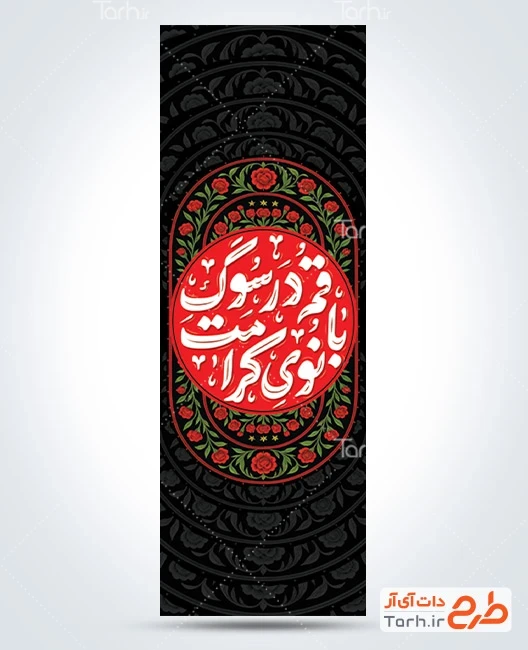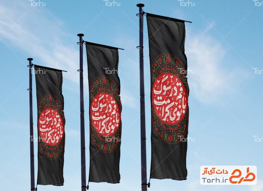 طرح پرچم عمودی وفات حضرت معصومه با فرمت psd و قابل ویرایش در نرم افزار فتوشاپ به صورت لایه باز توسط تیم طراحان طرح دات آی آر طراحی شده است. در طرح استند و لمپوست رحلت حضرت معصومه از تصاویر و المان های با کیفیت و متناسب با استاندارد چاپ استفاده گردیده است. طرح کتیبه عمودی رحلت حضرت معصومه شامل تایپوگرافی قم در سوگ بانوی کرامت می باشد که المان های استفاده شده در طرح پرچم پل رحلت حضرت معصومه قابلیت ویرایش، جابه جایی و تغییر سایز را دارا بوده و شما می توانید متناسب با سلیقه خودتان طرح بنر شهری وفات حضرت معصومه را ویرایش نمایید.