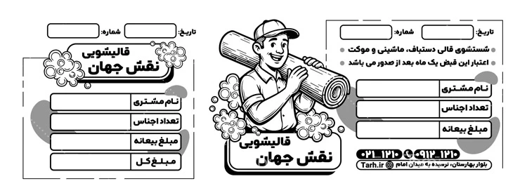 طرح آماده قبض سیاه سفید قالیشویی با فرمت psd و قابل ویرایش در نرمافزار فتوشاپ بهصورت لایه باز توسط تیم طراحان طرح دات آی آر طراحی شده است. در نمونه قبض قالی شویی از تصاویر و المانهای باکیفیت و متناسب با استاندارد چاپ استفادهشده، همچنین نکات مهم در طرح قبض رسید قالی شویی مانند رنگبندی، رعایت حاشیه، فاصلهها، فضای کافی برای درج متن، سایز و نوع فونت مناسب قبض قالیشویی خام و ... رعایت گردیده است. طرح لایه باز قبض قالی شویی شامل جایگاه مشخصات شرکت و وکتور مرد میباشد که المانهای استفادهشده در فرم خام قبض قالی شویی قابلیت ویرایش، جابهجایی و تغییر سایز را دارا بوده و شما میتوانید متناسب باسلیقه خودتان قبض لایه باز قالیشویی را ویرایش نمایید، همچنین با تغییر تصاویر و متنها میتوانید طرح قبض قالیشویی لایه باز را به طرح قبض کسب و کار مد نظر خود شخصی سازی نمایید.