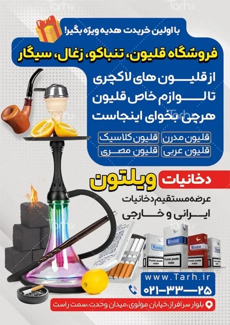 نمونه تراکت فروش دخانیات با فرمت psd و قابل ویرایش در نرمافزار فتوشاپ بهصورت لایه باز توسط تیم طراحان طرح دات آی آر طراحی شده است. در نمونه تراکت دخانیات از تصاویر و المانهای باکیفیت و متناسب با استاندارد چاپ استفادهشده، همچنین نکات مهم در طرح تراکت دخانیات مانند رنگبندی، رعایت حاشیه، فاصلهها، فضای کافی برای درج متن، سایز و نوع فونت مناسب طراحی تراکت و ... رعایت گردیده است. طرح لایه باز تراکت قلیان فروشی شامل عکس قلیان، سیگار و زغال میباشد که المانهای استفادهشده در طرح خام تراکت قلیان فروشی قابلیت ویرایش، جابهجایی و تغییر سایز را دارا بوده و شما میتوانید متناسب باسلیقه خودتان تراکت لایه باز دخانیات را ویرایش نمایید، همچنین با تغییر تصاویر و متنها میتوانید طرح تراکت سیگار و قلیان را به طرح تراکت کسب و کار مد نظر خود شخصی سازی نمایید.