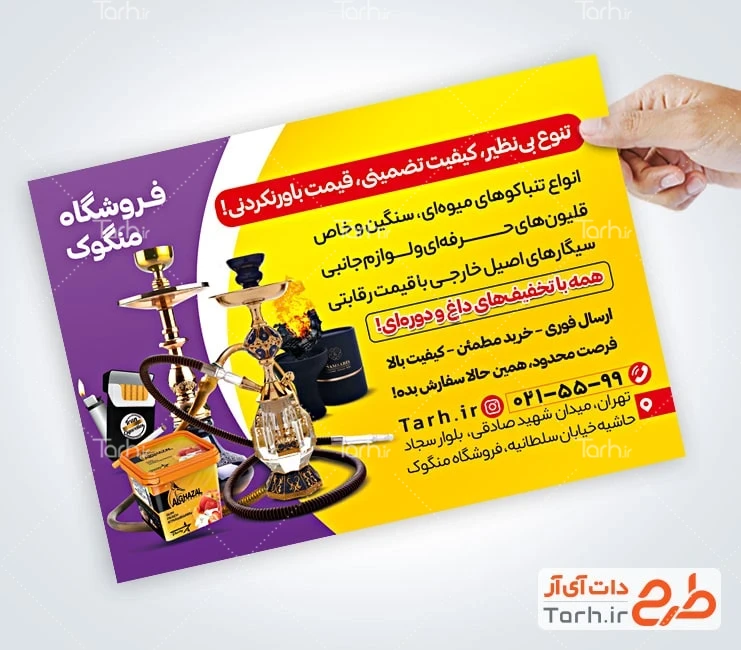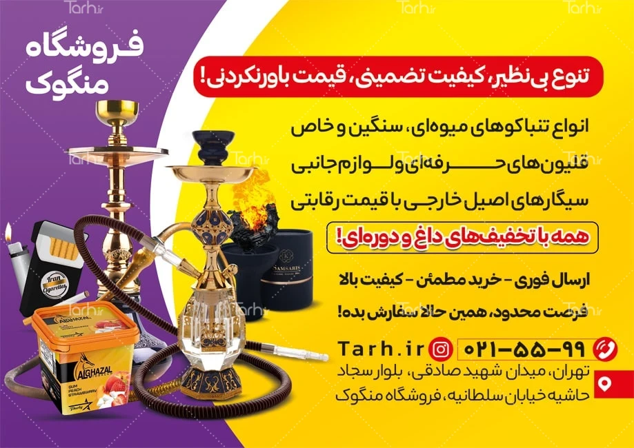 طرح آماده تراکت دخانیات با فرمت psd و قابل ویرایش در نرمافزار فتوشاپ بهصورت لایه باز توسط تیم طراحان طرح دات آی آر طراحی شده است. در نمونه تراکت دخانیات از تصاویر و المانهای باکیفیت و متناسب با استاندارد چاپ استفادهشده، همچنین نکات مهم در طرح تراکت دخانیات مانند رنگبندی، رعایت حاشیه، فاصلهها، فضای کافی برای درج متن، سایز و نوع فونت مناسب طراحی تراکت و ... رعایت گردیده است. طرح لایه باز تراکت قلیان فروشی شامل عکس قلیان، سیگار و معسل میباشد که المانهای استفادهشده در طرح خام تراکت قلیان فروشی قابلیت ویرایش، جابهجایی و تغییر سایز را دارا بوده و شما میتوانید متناسب باسلیقه خودتان تراکت لایه باز دخانیات را ویرایش نمایید، همچنین با تغییر تصاویر و متنها میتوانید طرح تراکت سیگار و قلیان را به طرح تراکت کسب و کار مد نظر خود شخصی سازی نمایید.