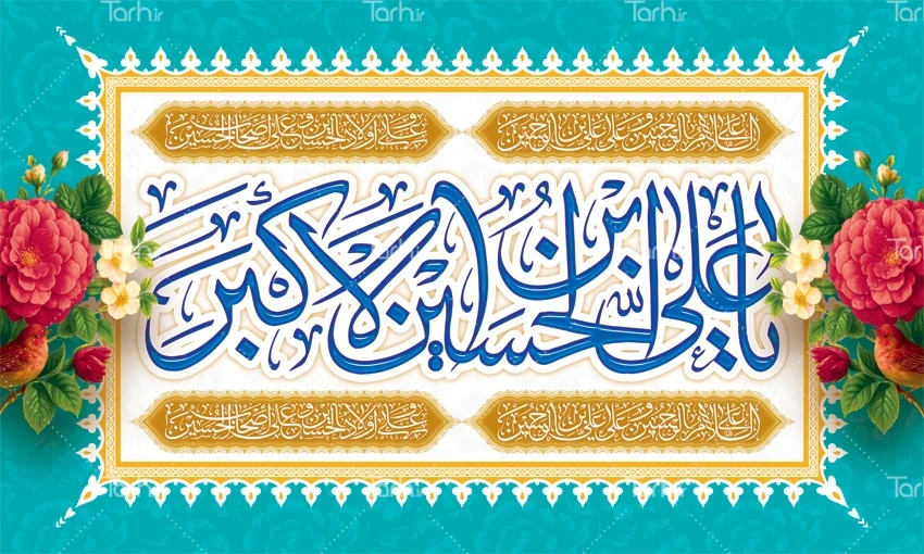 طرح بنر پشت سن میلاد حضرت علی اکبر با خوشنویسی چهار سلام کد فایل 3810574