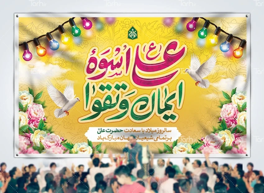 دانلود بنر پشت منبری میلاد امام علی با فرمت psd و قابل ویرایش در نرم افزار فتوشاپ به صورت لایه باز توسط تیم طراحان طرح دات آی آر طراحی شده است. در طرح لایه باز پشت منبر ولادت امام علی و روز پدر از تصاویر و المان های با کیفیت و متناسب با استاندارد چاپ استفاده گردیده است. طرح بنر ولادت حضرت علی شامل خوشنویسی علی اسوه ایمان و تقوا، وکتور چراغانی، کبوتر و گل میباشد که المان های استفاده شده در طرح بنر پشت مداح ولادت امام علی قابلیت ویرایش، جابه جایی و تغییر سایز را دارا بوده و شما می توانید متناسب با سلیقه خودتان طرح دکور میلاد حضرت علی لایه باز را ویرایش نمایید.