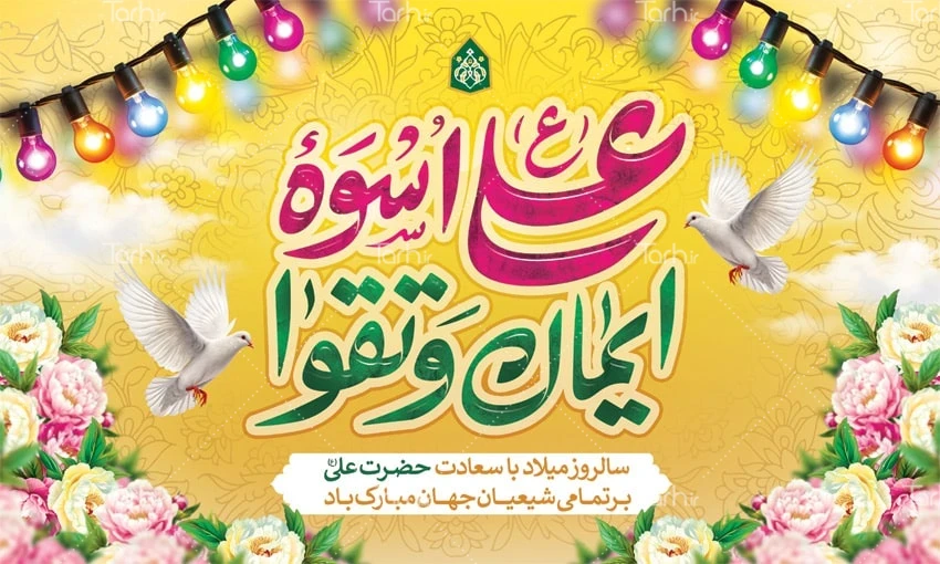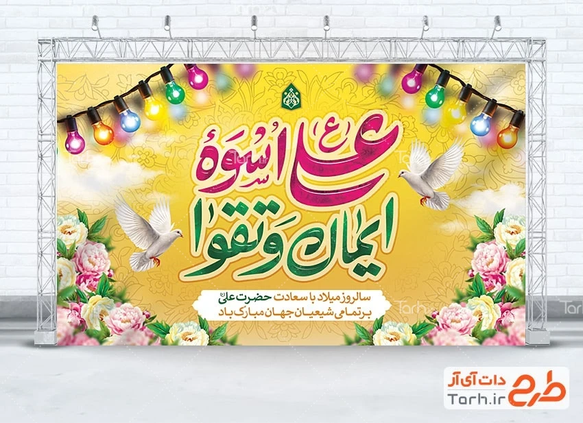 دانلود بنر پشت منبری میلاد امام علی با تایپوگرافی علی اسوه ایمان و تقوا کد فایل 3824571
