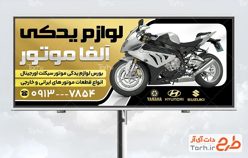 طرح بیلبورد تبلیغاتی لوازم یدکی موتورسیکلت با رنگ بندی مشکی طلایی کد فایل 3825971