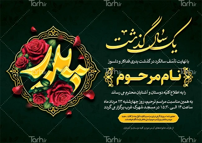 طرح لایه باز اطلاعیه سالگرد پدر با فرمت psd و قابل ویرایش در نرمافزار فتوشاپ بهصورت لایه باز توسط تیم طراحان طرح دات آی آر طراحی شده است. در فایل لایه باز اعلامیه ترحیم پدر از تصاویر و المانهای باکیفیت و متناسب با استاندارد چاپ استفادهشده، همچنین نکات مهم در طرح آگهی ترحیم پدر مانند رنگبندی، رعایت حاشیه، فاصلهها، فضای کافی برای درج متن، سایز و نوع فونت مناسب طراحی آگهی ترحیم و ... رعایت گردیده است. طرح خام آگهی ترحیم پدر شامل خوشنویسی پدر، وکتور گل و کبوتر میباشد که المانهای استفادهشده در آگهی ترحیم لایه باز پدر قابلیت ویرایش، جابهجایی و تغییر سایز را دارا بوده و شما میتوانید متناسب باسلیقه خودتان نمونه اعلامیه ترحیم پدر را ویرایش نمایید.
