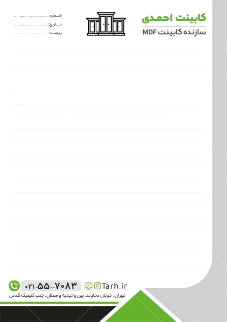 طرح سربرگ لایه باز کابینت سازی با فرمت psd و قابل ویرایش در نرمافزار فتوشاپ بهصورت لایه باز توسط تیم طراحان طرح دات آی آر طراحی شده است. در طرح لایه باز سربرگ کابینت فروشی از المانهای باکیفیت و متناسب با استاندارد چاپ استفادهشده، همچنین نکات مهم در طرح سربرگ خام کابینت سازی مانند رنگبندی، رعایت حاشیه، فاصلهها، فضای کافی برای درج متن، سایز و نوع فونت مناسب طراحی سربرگ و ... رعایت گردیده است. سربرگ لایه باز کابینت سازی شامل لوگو کابینت سازی و محل جایگذاری مشخصات میباشد که المانهای استفادهشده در نمونه سربرگ کابینت سازی قابلیت ویرایش، جابهجایی و تغییر سایز را دارا بوده و شما میتوانید متناسب باسلیقه خودتان طرح سربرگ کابینت فروشی را ویرایش نمایید، همچنین با تغییر لوگو و متنها میتوانید طرح سربرگ کابینت سازی را به طرح سربرگ کسب و کار مد نظر خود شخصی سازی نمایید. در اسناد و نامههای اداری و تجاری، سربرگ به عنوان وسیلهای برای نمایش اطلاعاتی مانند نام و لوگو یک شرکت یا سازمان، عنوان سند، تاریخ، شماره صفحه و اطلاعات تماس ( شماره تلفن، آدرس پستی، وبسایت و ایمیل) به کار میرود. این اطلاعات به دریافتکننده کمک میکند تا به راحتی با شرکت یا سازمان تماس بگیرد یا از منابع اطلاعاتی بیشتری بهرهبرداری کند.