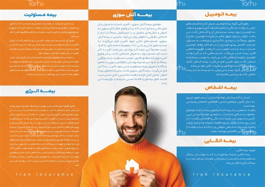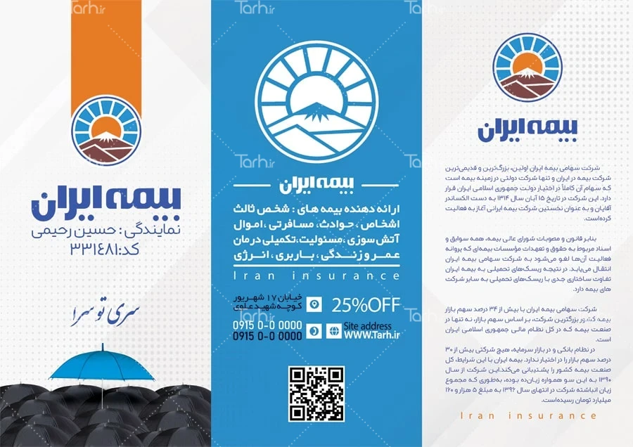 ابعاد فایل لایه باز بروشور بیمه در جدول ویژگی های فایل درج شده و با توجه به لایه باز بودن و کیفیت بالای طرح بروشور بیمه ایران، قابلیت ویرایش و تبدیل به سایز دلخواه، افزودن لت های جدید و همچنین چاپ در ابعاد و متریال های مختلف را دارا می باشد. همچنین بروشور خام بیمه ایران قابلیت چاپ افست و دیجیتال بدون افت کیفیت را دارد. بروشور یکی از ابزارهای تبلیغاتی است که برای تبلیغات محصولات، خدمات و رویدادها از آن در محلهای عمومی مانند نمایشگاهها، ساختمانهای دولتی، مراکز خرید، دفاتر، مطبها و ...استفاده میشود و درصورتی که تمایل به چاپ بروشور ندارید می توانید فایل نهایی بروشور را از طریق شبکه های اجتماعی برای مشتریان، کاربران و بازار هدف خود ارسال نمایید.