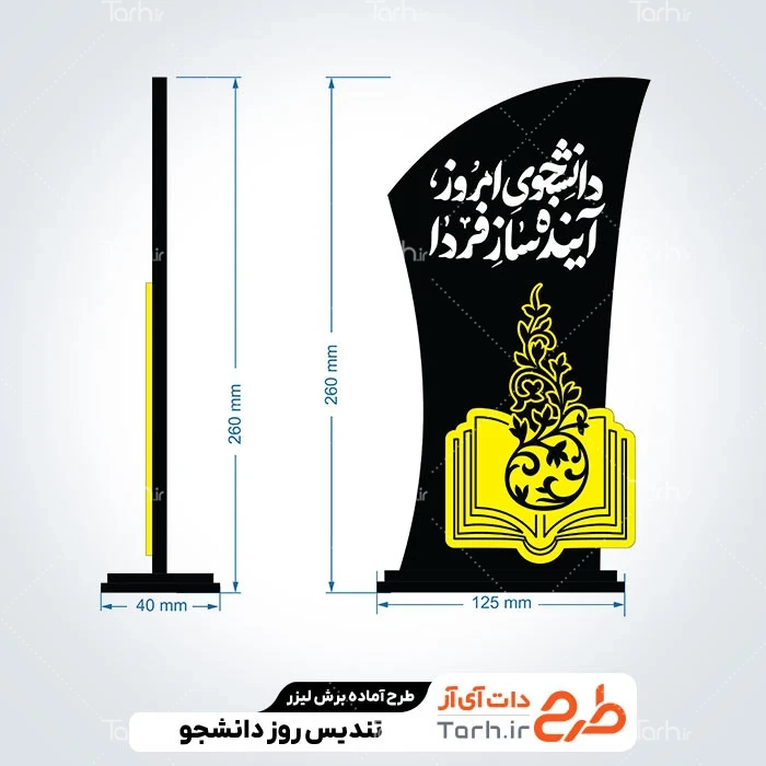 طرح آماده لیزر تندیس روز دانشجو با نرم افزار Corel Draw به صورت لایه باز و قابل ویرایش توسط تیم طراحان طرح دات آی آر طراحی شده است. در طرح آماده برش لیزری استند روز دانشجو نکات مهم طراحی لیزر مانند رعایت ضخامت چوب، ابعاد استاندارد طرح و چیدمان درست برای کمترین پرتی رعایت گردیده است. طرح برش لیزری تندیس روز دانشجو، آماده اجرا توسط دستگاه های برش، سی ان سی (CNC)، حکاکی لیزر و حکاکی روی چوب میباشد. شما میتوانید از طرح لایه باز تندیس دانشجویی و دانشگاه جهت تولید انواع طرح تندیس و استند تجلیل دانشجو دانشگاه علمی کاربردی به عنوان هدیه در مراسمات تجلیل از دانشجو دانشگاه علمی کاربردی استفاده کنید.