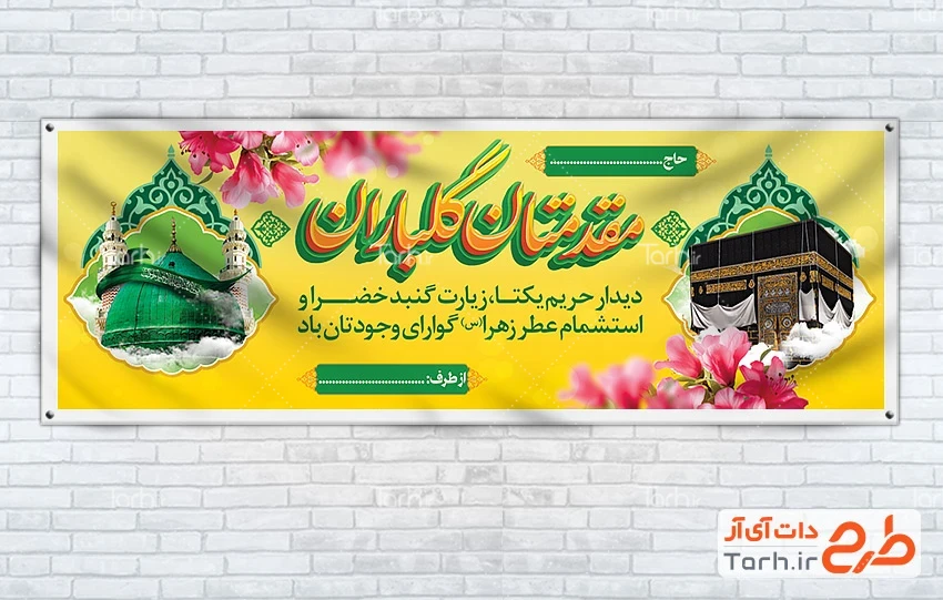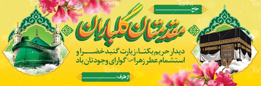 طرح لایه باز بنر خوش آمد گویی زائر مکه دارای متن سه بعدی مقدمتان گلباران کد فایل 3901654