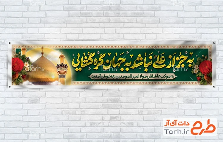 طرح بنر موکب ولادت امام علی با تایپوگرافی به جز از علی نباشد به جهان گره گشایی کد فایل 3942857