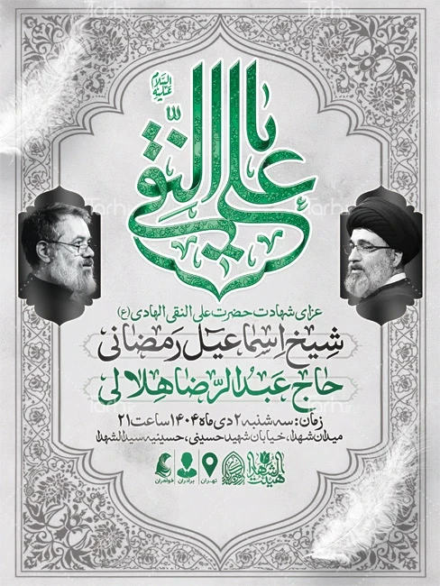 طرح پوستر اطلاعیه شهادت امام هادی با فرمت psd و قابل ویرایش در نرم افزار فتوشاپ به صورت لایه باز توسط تیم طراحان طرح دات آی آر طراحی شده است. در طرح لایه باز اطلاعیه شهادت امام هادی از تصاویر و المان های با کیفیت و متناسب با استاندارد چاپ استفاده گردیده است. طرح اطلاعیه خام بنر شهادت امام علی النقی شامل تایپوگرافی یا علی النقی و دارای زمان و مکان مراسم روضه و عزاداری می باشد که المان های استفاده شده در بنر شهادت امام هادی قابلیت ویرایش، جابه جایی و تغییر سایز را دارا بوده و شما می توانید متناسب با سلیقه خودتان طرح اطلاعیه شهادت امام علی نقی را ویرایش نمایید.