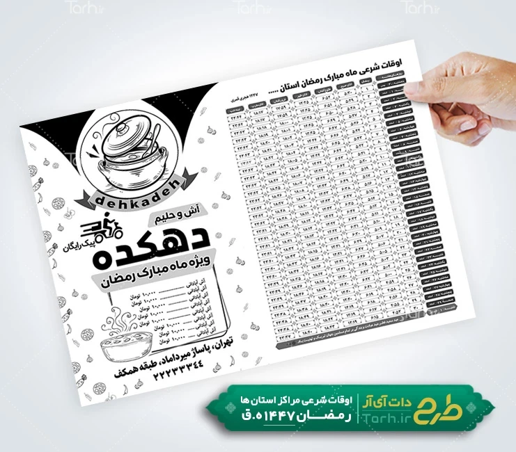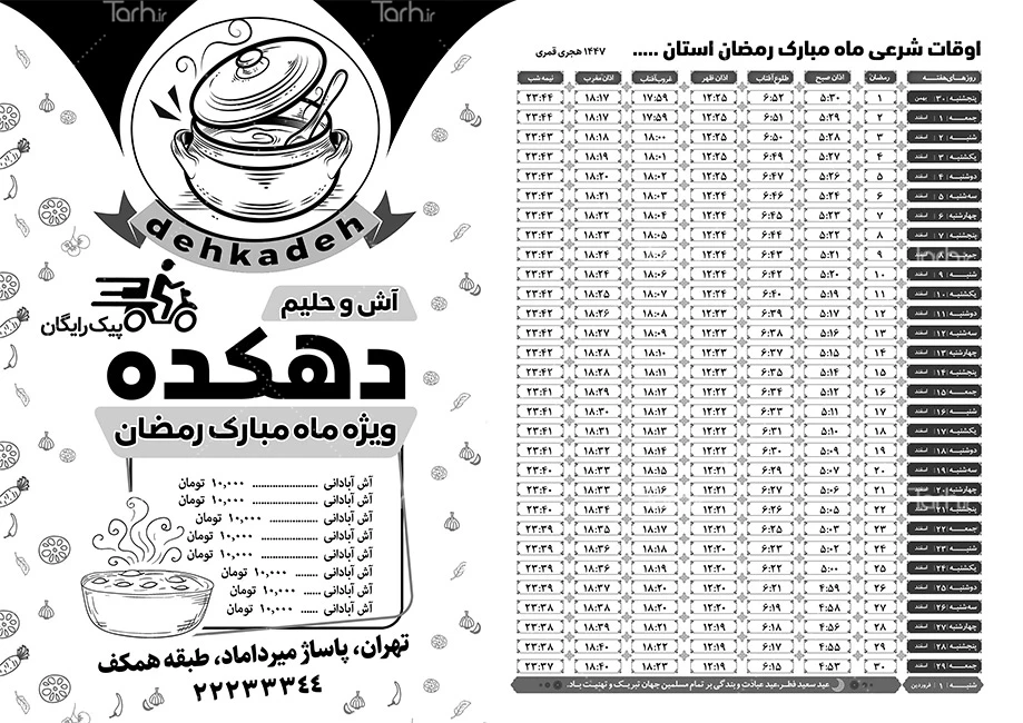 طرح خام تراکت سیاه سفید آش و حلیم با فرمت psd و قابل ویرایش در نرم افزار فتوشاپ به صورت لایه باز توسط تیم طراحان طرح دات آی آر طراحی شده است. لازم به ذکر است که طرح اوقات شرعی ماه رمضان برگرفته از موسسه ژئوفیزیک میباشد. همچنین در تراکت ریسو آش فروشی و اوقات شرعی رمضان از تصاویر و المان های با کیفیت و متناسب با استاندارد چاپ استفاده گردیده است. طرح ریسو اوقات شرعی رمضان و فروشگاه آش و هلیم شامل جدول اوقات شرعی رمضان سال 1404، مراکز استانها، وکتور ظرف آش و حلیم و وکتور دیگ می باشد که المان های استفاده شده در تراکت ریسو لایه باز اوقات شرعی رمضان قابلیت ویرایش، جابه جایی و تغییر سایز را دارا بوده و شما می توانید متناسب با سلیقه خودتان طرح اوقات شرعی را ویرایش نمایید.