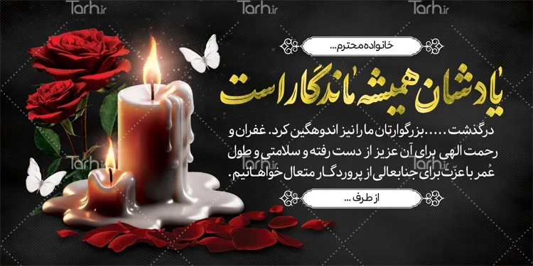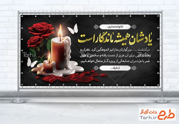 پلاکارد خام عرض تسلیت با فرمت psd و قابل ویرایش در نرم افزار فتوشاپ به صورت لایه باز توسط تیم طراحان طرح دات آی آر طراحی شده است. در طرح لایه باز تسلیت از تصاویر و المان های با کیفیت و متناسب با استاندارد چاپ استفاده گردیده است. طرح بنر تسلیت خام شامل عکس شمع و گل و پروانه و خوشنویسی یادشان همیشه ماندگار است می باشد که المان های استفاده شده در بنر لایه باز تسلیت قابلیت ویرایش، جابه جایی و تغییر سایز را دارا بوده و شما می توانید متناسب با سلیقه خودتان طرح عرض تسلیت را ویرایش نمایید.