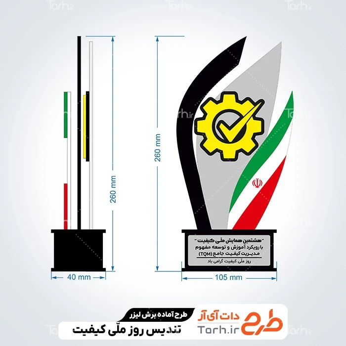 طرح خام برش لیزری تندیس روز ملی کیفیت با نرم افزار Corel Draw به صورت لایه باز و قابل ویرایش توسط تیم طراحان طرح دات آی آر طراحی شده است. در طرح آماده برش لیزری استند کیفیت نکات مهم طراحی لیزر مانند رعایت ضخامت چوب، ابعاد استاندارد طرح و چیدمان درست برای کمترین پرتی رعایت گردیده است. طرح برش لیزری تندیس روز کیفیت، آماده اجرا توسط دستگاه های برش، سی ان سی (CNC)، حکاکی لیزر و حکاکی روی چوب میباشد. شما میتوانید از طرح لیزر کیفیت جهت تولید انواع تندیس و استند روز جهانی کیفیت به عنوان هدیه در مراسمات روز جهانی کیفیت استفاده کنید.