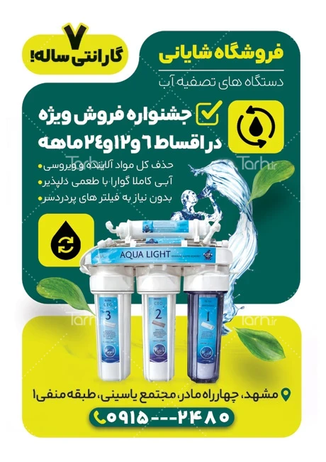 طرح تراکت آماده فروش و نصب دستگاه تصفیه آب با فرمت psd و قابل ویرایش در نرمافزار فتوشاپ بهصورت لایه باز توسط تیم طراحان طرح دات آی آر طراحی شده است. در نمونه تراکت تصفیه آب از تصاویر و المانهای باکیفیت و متناسب با استاندارد چاپ استفادهشده، همچنین نکات مهم در دانلود تراکت دستگاه تصفیه آب مانند رنگبندی، رعایت حاشیه، فاصلهها، فضای کافی برای درج متن، سایز و نوع فونت مناسب طراحی تراکت و ... رعایت گردیده است. طرح لایه باز تراکت فروشگاه دستگاه تصفیه آب شامل عکس دستگاه تصفیه آب میباشد که المانهای استفادهشده در طرح تراکت فروشگاه دستگاه تصفیه آب قابلیت ویرایش، جابهجایی و تغییر سایز را دارا بوده و شما میتوانید متناسب باسلیقه خودتان تراکت دستگاه تصفیه آب را ویرایش نمایید، همچنین با تغییر تصاویر و متنها میتوانید طرح تراکت تصفیه آب را به طرح تراکت کسب و کار مد نظر خود شخصی سازی نمایید.