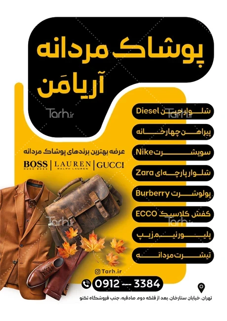 طرح پوستر تبلیغاتی پوشاک آقایان با فرمت psd و قابل ویرایش در نرمافزار فتوشاپ بهصورت لایه باز توسط تیم طراحان طرح دات آی آر طراحی شده است. در نمونه پوستر تبلیغاتی پوشاک مردانه از تصاویر و المانهای باکیفیت و متناسب با استاندارد چاپ استفادهشده، همچنین نکات مهم در طرح تراکت پوشاک آقایان مانند رنگبندی، رعایت حاشیه، فاصلهها، فضای کافی برای درج متن، سایز و نوع فونت مناسب طراحی تراکت و ... رعایت گردیده است. طرح لایه باز تراکت فروشگاه پوشاک آقایان شامل عکس کاپشن، کیف و کفش مردانه و رنگبندی مشکی طلایی میباشد که المانهای استفادهشده در طرح تراکت پوشاک مردانه قابلیت ویرایش، جابهجایی و تغییر سایز را دارا بوده و شما میتوانید متناسب باسلیقه خودتان تراکت لایه باز فروش پوشاک مردانه را ویرایش نمایید، همچنین با تغییر تصاویر و متنها میتوانید طرح تراکت پوشاک آقایان را به طرح تراکت کسب و کار مد نظر خود شخصی سازی نمایید.