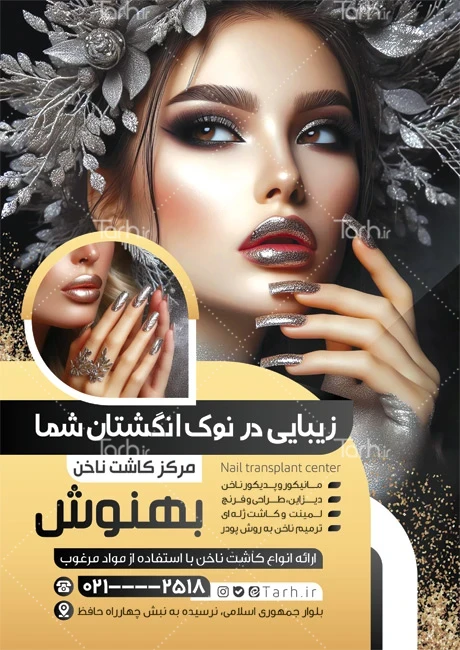 دانلود طرح تراکت خدمات کاشت ناخن با فرمت psd و قابل ویرایش در نرمافزار فتوشاپ بهصورت لایه باز توسط تیم طراحان طرح دات آی آر طراحی شده است. در نمونه تراکت مرکز کاشت ناخن از تصاویر و المانهای باکیفیت و متناسب با استاندارد چاپ استفادهشده، همچنین نکات مهم در طرح تراکت آرایشگاه زنانه مانند رنگبندی، رعایت حاشیه، فاصلهها، فضای کافی برای درج متن، سایز و نوع فونت مناسب طراحی تراکت و ... رعایت گردیده است. طرح لایه باز تراکت مرکز کاشت ناخن و آرایشگاه بانوان شامل عکس ناخن و رنگبندی مشکی طلایی میباشد که المانهای استفادهشده در طرح تراکت خدمات ناخن قابلیت ویرایش، جابهجایی و تغییر سایز را دارا بوده و شما میتوانید متناسب باسلیقه خودتان تراکت خام کاشت ناخن را ویرایش نمایید، همچنین با تغییر تصاویر و متنها میتوانید طرح تراکت خام مرکز کاشت ناخن را به طرح تراکت کسب و کار مد نظر خود شخصی سازی نمایید.