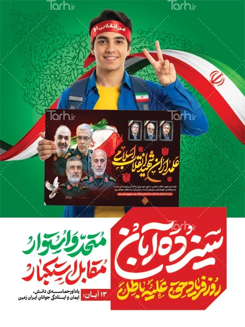 طرح psd بنر 13 آبان روز مبارزه با استکبار جهانی با فرمت psd و قابل ویرایش در نرم افزار فتوشاپ به صورت لایه باز توسط تیم طراحان طرح دات آی آر طراحی شده است. در طرح بنر 13 آبان از تصاویر و المان های با کیفیت و متناسب با استاندارد چاپ استفاده گردیده است. طرح بنر روز دانش آموز شامل تایپوگرافی سیزده آبان روز فریاد حق علیه باطل می باشد که المان های استفاده شده در طرح لایه باز بنر روز دانش آموز قابلیت ویرایش، جابه جایی و تغییر سایز را دارا بوده و شما می توانید متناسب با سلیقه خودتان طرح 13 آبان را ویرایش نمایید.