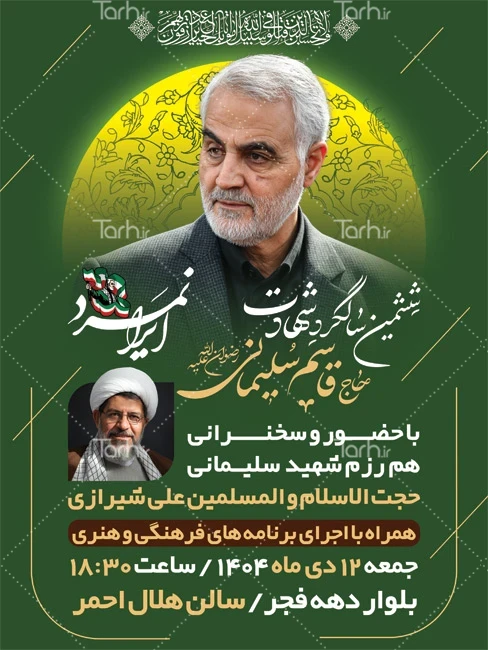 پوستر خام اطلاعیه مراسم شهادت حاج قاسم سلیمانی با خوشنویسی شعار ایرانمرد کد فایل 4197325