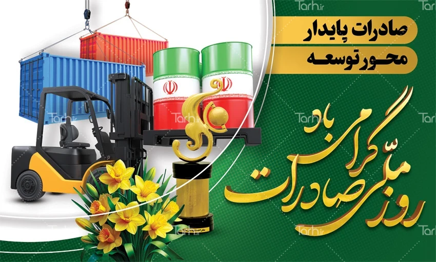 طرح لایه باز بنر روز صادرات با فرمت psd و قابل ویرایش در نرم افزار فتوشاپ به صورت لایه باز توسط تیم طراحان طرح دات آی آر طراحی شده است. در طرح لایه باز تبریک روز صادرات از تصاویر و المان های با کیفیت و متناسب با استاندارد چاپ استفاده گردیده است. طرح بنر روز ملی صادرات شامل عکس بشکنه نفت و گل می باشد که المان های استفاده شده در بنر روز صادرات قابلیت ویرایش، جابه جایی و تغییر سایز را دارا بوده و شما می توانید متناسب با سلیقه خودتان طرح روز ملی صادرات را ویرایش نمایید.