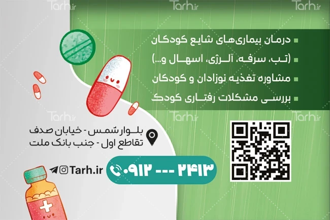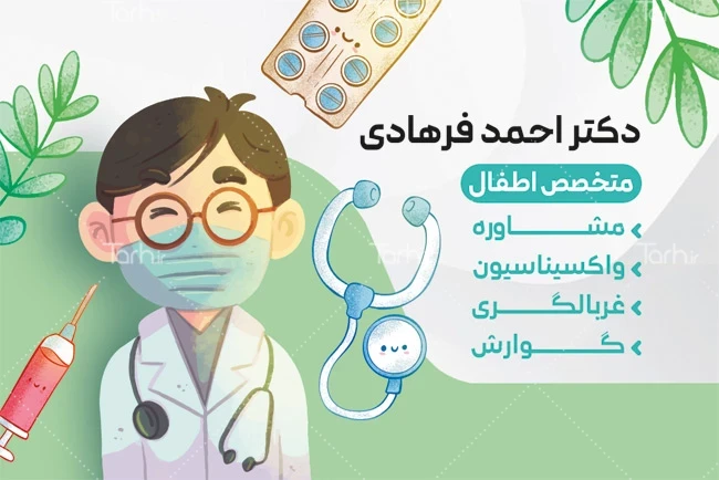 طرح کارت ویزیت تبلیغاتی دکتر اطفال با فرمت psd و قابل ویرایش در نرمافزار فتوشاپ بهصورت لایه باز و پشت و رو (دو رو) توسط تیم طراحان طرح دات آی آر طراحی شده است. دانلود کارت ویزیت پزشک اطفال از تصاویر و المانهای باکیفیت و متناسب با استاندارد چاپ استفادهشده، همچنین نکات مهم در طرح کارت ویزیت مانند رنگبندی، رعایت حاشیه، فاصلهها، فضای کافی برای درج متن، سایز و نوع فونت مناسب طراحی کارت ویزیت و ... رعایت گردیده است. نمونه کارت ویزیت دکتر اطفال شامل تصویرسازی پزشک مرد میباشد که المانهای استفادهشده در طرح کارت ویزیت متخصص اطفال قابلیت ویرایش، جابهجایی و تغییر سایز را دارا بوده و شما میتوانید متناسب باسلیقه خودتان کارت ویزیت لایه باز دکتر اطفال را ویرایش نمایید، همچنین با تغییر تصاویر و متنها میتوانید طرح کارت ویزیت پزشک اطفال را به طرح کارت ویزیت کسب و کار مد نظر خود شخصی سازی نمایید.