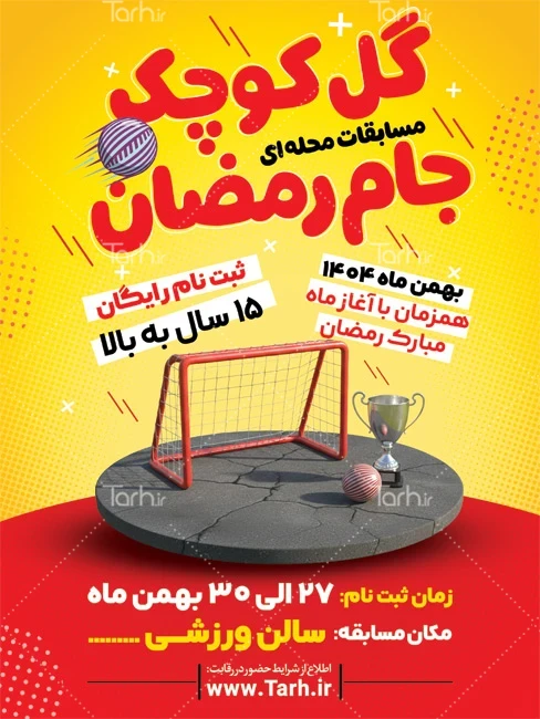 طرح پوستر مسابقات جام رمضان با فرمت psd و قابل ویرایش در نرم افزار فتوشاپ به صورت لایه باز توسط تیم طراحان طرح دات آی آر طراحی شده است. در طرح پوستر اطلاع رسانی مسبقات جام رمضان از تصاویر و المان های با کیفیت و متناسب با استاندارد چاپ استفاده گردیده است. طرح اطلاعیه مسابقه گل کوچک رمضان شامل عکس جام قهرمانی مسابقات ورزشی و عکس دروازه و توپ میباشد که المان های استفاده شده در اعلامیه مسابقه ورزشی قابلیت ویرایش، جابه جایی و تغییر سایز را دارا بوده و شما می توانید متناسب با سلیقه خودتان طرح پوستر مسابقه جام رمضان را ویرایش نمایید.