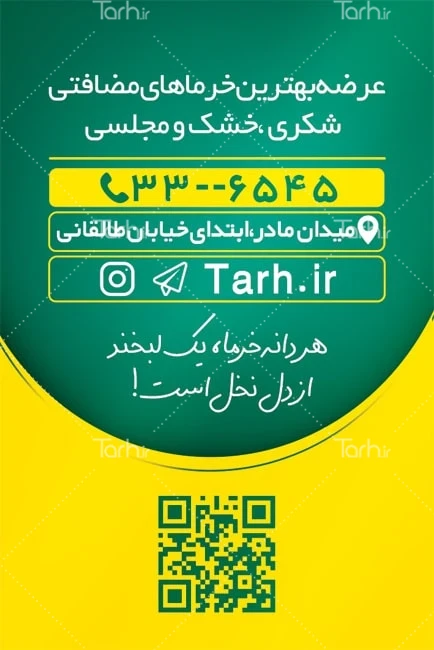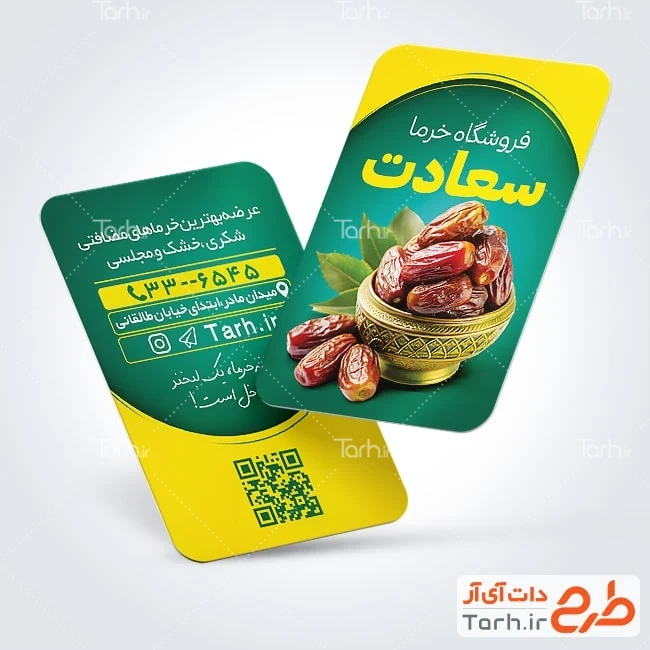 طرح آماده کارت ویزیت خرما فروشی با فرمت psd و قابل ویرایش در نرمافزار فتوشاپ بهصورت لایه باز و پشت و رو (دو رو) توسط تیم طراحان طرح دات آی آر طراحی شده است. طرح کارت ویزیت خرما فروشی از تصاویر و المانهای باکیفیت و متناسب با استاندارد چاپ استفادهشده، همچنین نکات مهم در طرح کارت ویزیت مانند رنگبندی، رعایت حاشیه، فاصلهها، فضای کافی برای درج متن، سایز و نوع فونت مناسب طراحی کارت ویزیت و ... رعایت گردیده است. نمونه کارت ویزیت فروش خرما شامل عکس ظرف خرما و رطب میباشد که المانهای استفادهشده در طرح کارت ویزیت فروشگاه خرما قابلیت ویرایش، جابهجایی و تغییر سایز را دارا بوده و شما میتوانید متناسب باسلیقه خودتان کارت ویزیت لایه باز خرما فروشی را ویرایش نمایید، همچنین با تغییر تصاویر و متنها میتوانید طرح کارت ویزیت خرما و رطب را به طرح کارت ویزیت کسب و کار مد نظر خود شخصی سازی نمایید.