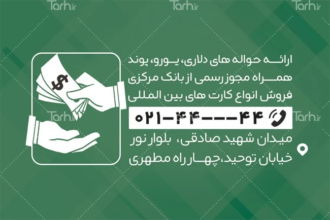 طرح آماده کارت ویزیت صرافی با فرمت psd و قابل ویرایش در نرمافزار فتوشاپ بهصورت لایه باز و پشت و رو (دو رو) توسط تیم طراحان طرح دات آی آر طراحی شده است. طرح کارت ویزیت صرافی از تصاویر و المانهای باکیفیت و متناسب با استاندارد چاپ استفادهشده، همچنین نکات مهم در طرح کارت ویزیت مانند رنگبندی، رعایت حاشیه، فاصلهها، فضای کافی برای درج متن، سایز و نوع فونت مناسب طراحی کارت ویزیت و ... رعایت گردیده است. نمونه کارت ویزیت صرافی شامل وکتور دلار میباشد که المانهای استفادهشده در طرح کارت ویزیت ازرهای دیجیتال و بیت کوین قابلیت ویرایش، جابهجایی و تغییر سایز را دارا بوده و شما میتوانید متناسب باسلیقه خودتان کارت ویزیت لایه باز صرافی را ویرایش نمایید، همچنین با تغییر تصاویر و متنها میتوانید طرح کارت ویزیت خرید و فروش ارز را به طرح کارت ویزیت کسب و کار مد نظر خود شخصی سازی نمایید.