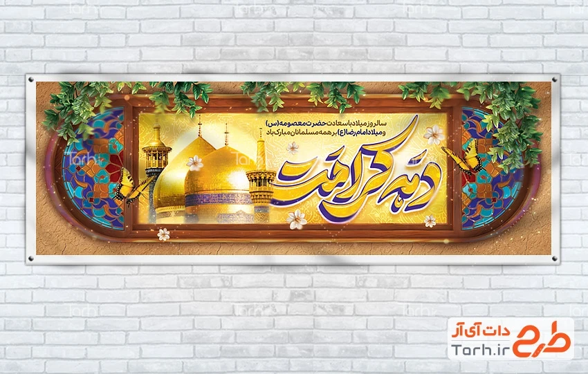 دانلود پلاکارد دهه کرامت با فرمت psd و قابل ویرایش در نرم افزار فتوشاپ به صورت لایه باز توسط تیم طراحان طرح دات آی آر طراحی شده است. در طرح پلاکارد ولادت حضرت معصومه از تصاویر و المان های با کیفیت و متناسب با استاندارد چاپ استفاده گردیده است. بنر خام میلاد حضرت معصومه شامل خوشنویسی دهه کرامت و عکس حرم حضرت معصومه و امام رضا می باشد که المان های استفاده شده در بنر لایه باز دهه کرامت و ولادت حضرت معصومه قابلیت ویرایش، جابه جایی و تغییر سایز را دارا بوده و شما می توانید متناسب با سلیقه خودتان پلاکارد تبریک ولادت حضرت معصومه لایه باز را ویرایش نمایید.