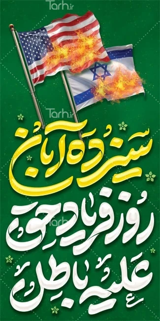 دانلود طرح لمپوست 13 آبان با فرمت psd و قابل ویرایش در نرم افزار فتوشاپ به صورت لایه باز توسط تیم طراحان طرح دات آی آر طراحی شده است. در طرح لایه باز استند 13 آبان از تصاویر و المان های با کیفیت و متناسب با استاندارد چاپ استفاده گردیده است. طرح بنر ایستاده روز دانش آموز شامل تایپوگرافی پرچم اسرائیل و آمریکا آتش گرفته شده و خوشنویسی روز سیزده آبان روز حق علیه باطل می باشد که المان های استفاده شده در بنر خام روز دانش آموز قابلیت ویرایش، جابه جایی و تغییر سایز را دارا بوده و شما می توانید متناسب با سلیقه خودتان طرح بنر 13 آبان را ویرایش نمایید.